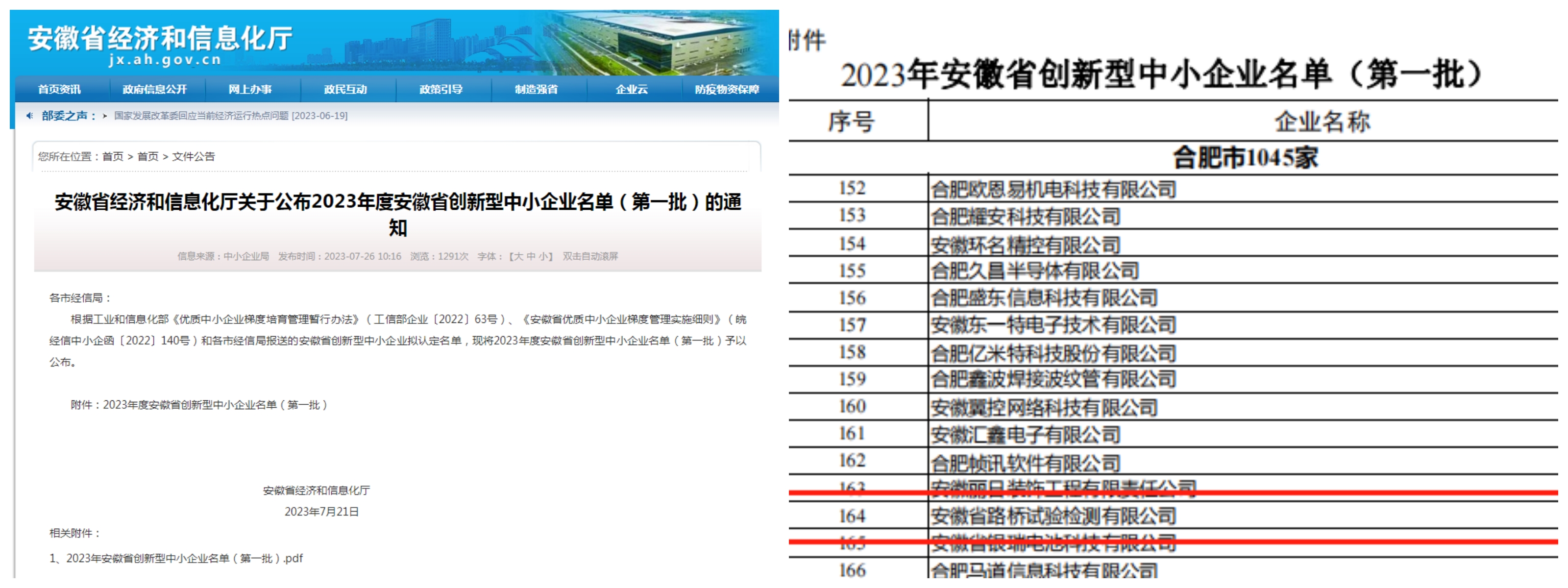 近日, 安徽省經濟和信息化廳發布安徽省2023年度“創新型中小企業”名單(第一批)和 “專精特新中小企業”名單,安徽省路橋試驗檢測有限公司兩項申報均獲批入選。