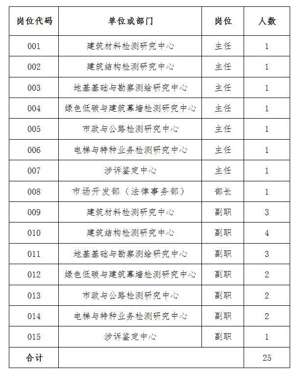 (一)具體崗位:檢測研究中心主任、市場開發部(法律事務部)部長等中層正職崗位8名;檢測研究中心副主任、主任工程師等中層副職崗位17名。
