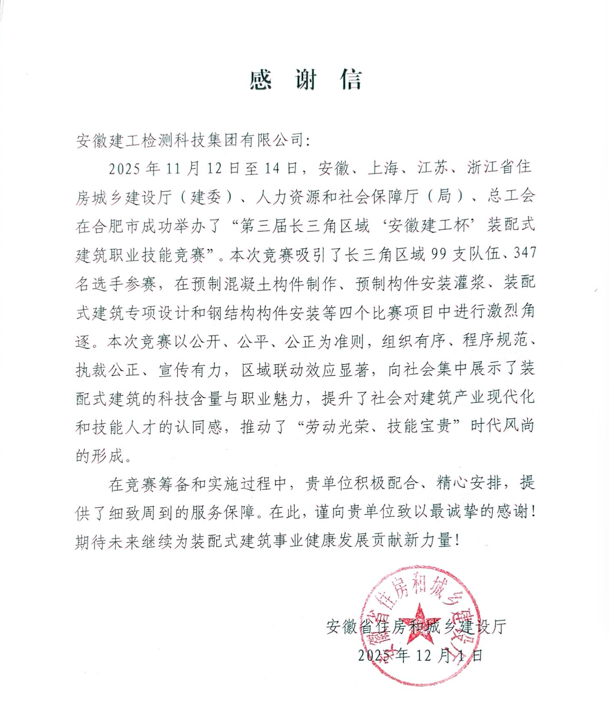 近日,公司收到安徽省住房與城鄉(xiāng)建設(shè)廳感謝信,對(duì)公司服務(wù)保障“第三屆長三角區(qū)域‘安徽建工杯’裝配式建筑職業(yè)技能大賽”作出的積極貢獻(xiàn)表示感謝。